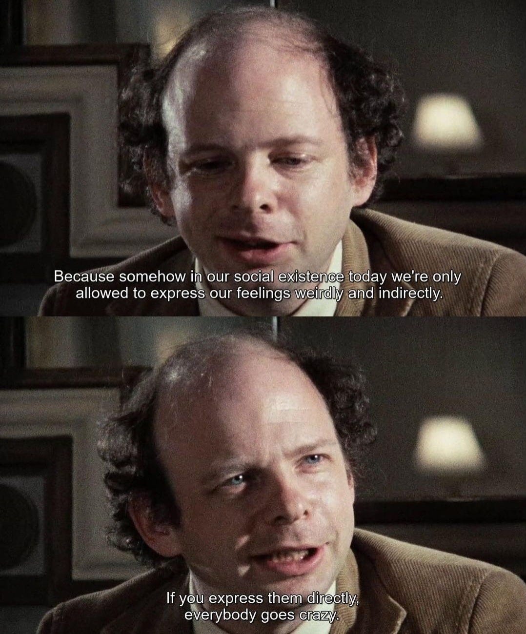 Wallace Shawn, jucând o versiune a lui George Constanza inconfundabilă cu omul pe care îl cunoaștem din nenumărate roluri secundare comice (The Princess Bride) – scund, șifonat, cu ochii mari de la panica existenței de zi cu zi înaintează trudnic prin străzile înzăpezite ale New Yorkului spre o cină pe care a evitat-o ani de zile. Vechiul său prieten André Gregory a devenit un zvon: regizorul de teatru avangardist care a dispărut în păduri, deșerturi și comune, apărând doar ca să plângă după filmele lui Ingmar Bergman. Wally se așteaptă doar la momente de stânjeneală, poate la o prelegere nesfârșită, dar nici o problemă - din moment ce Andre plătește. Ce primește este ceva mai apropiat de o delir verbal, un torent de două ore care pare un Seinfeld dacă Jerry ar fi rătăcit în Bohemian Grove, ar fi comandat escargot parazitat și apoi ar fi petrecut seara dezbătând dacă însăși realitatea a fost anulată de reptilieni. Conversația a gravitat constant în jurul ideii de a fi adormit în timp ce ești viu. Nu amorțit, exact, ci doar vag funcțional, trecând prin rutine, responsabilități și așteptări cu suficientă competență încât să o poți numi „o viață”. M-a făcut să mă simt inconfortabil, pentru că m-am recunoscut în acele experiențe mai mult decât voiam să admit.